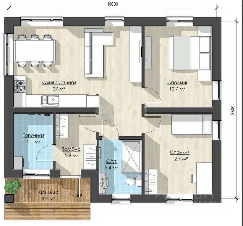 Дом имеет современную планировку с большой кухней-гостиной 27 кв м и двумя спальнями. Санузел довольно просторный 5,5 кв м. Несомненным преимуществом проекта является налицие хоз помещения, в котором по проекту расположен котел. Подписан и оплачен договор с Газпромом.