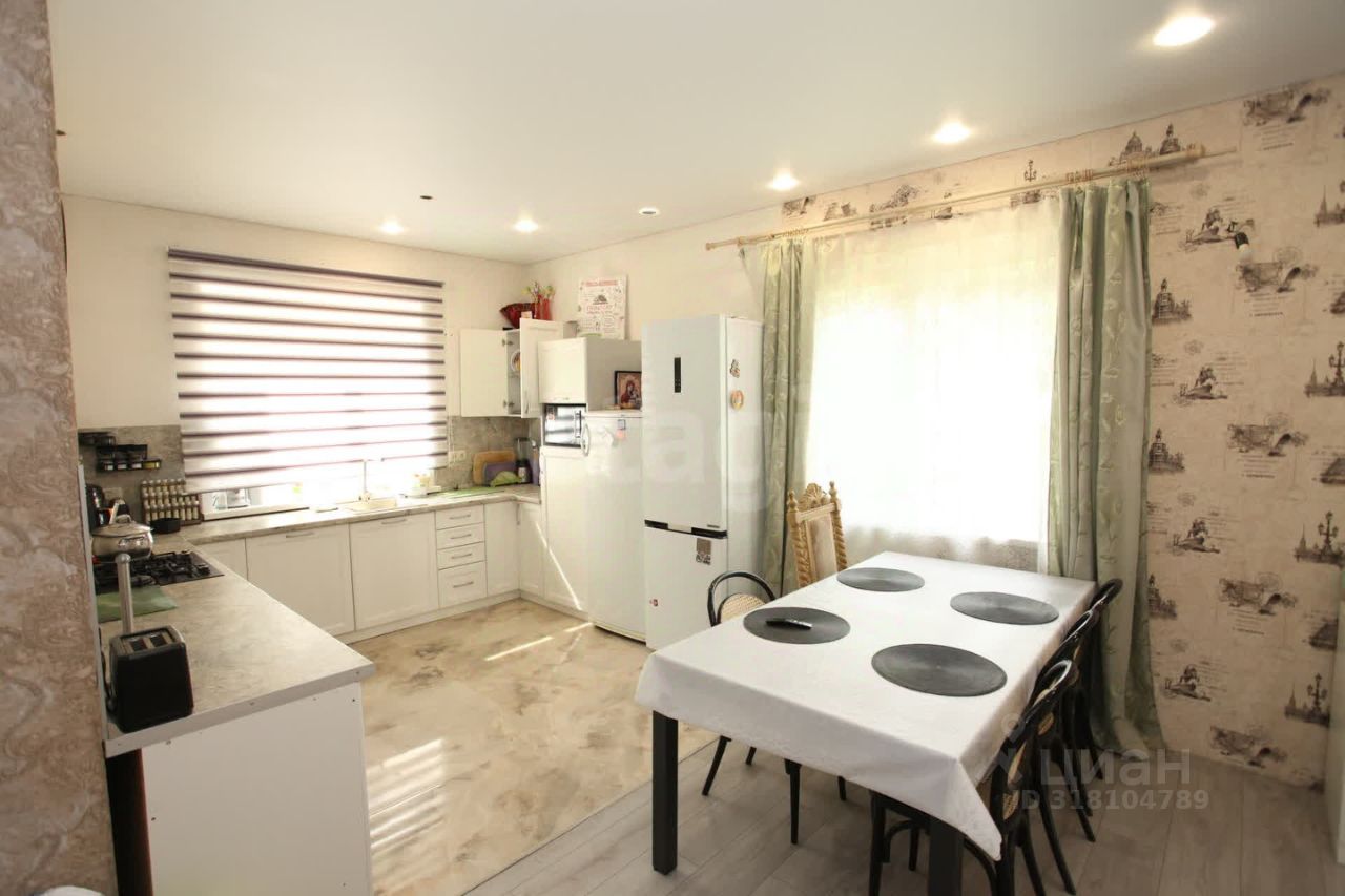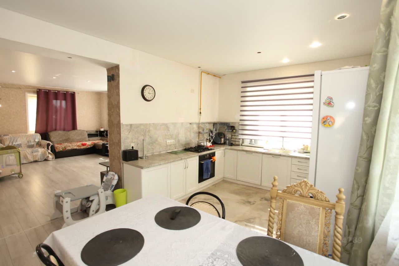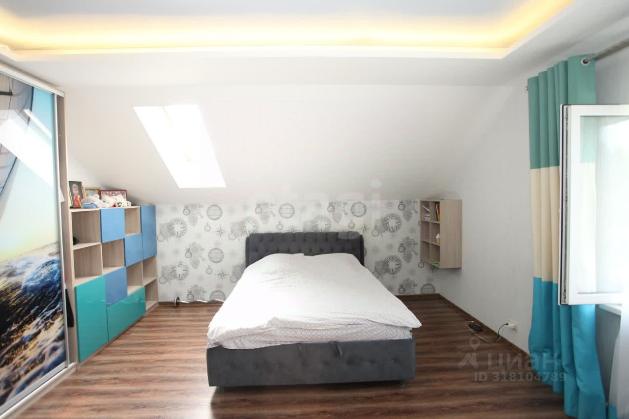 В доме 2 этажа, на первом большая кухня, гостиная, санузел, болерная и большая террасса с витражными окнами. На втором - 3 спальни, санузел, гардеробная и 2 балкона.