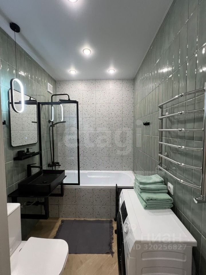 Совмещенный санузел с тропическим душем в ванной и стиральной машиной.