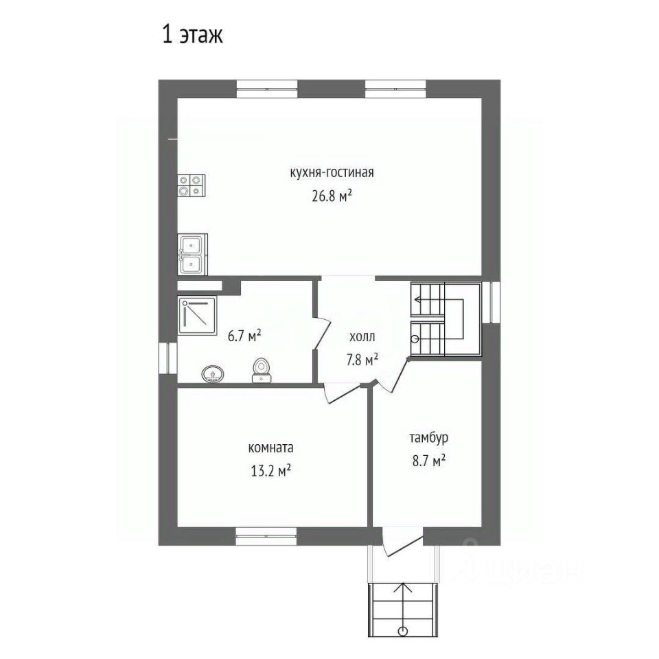 На общей площади 130 кв.м. располагаются 4 комнаты, 11,7/12,2/13,2/26,8 кв.м., просторная кухня-гостиная 26,8 кв.м., 2 сан. узла, просторный холл 8,7 кв.м.