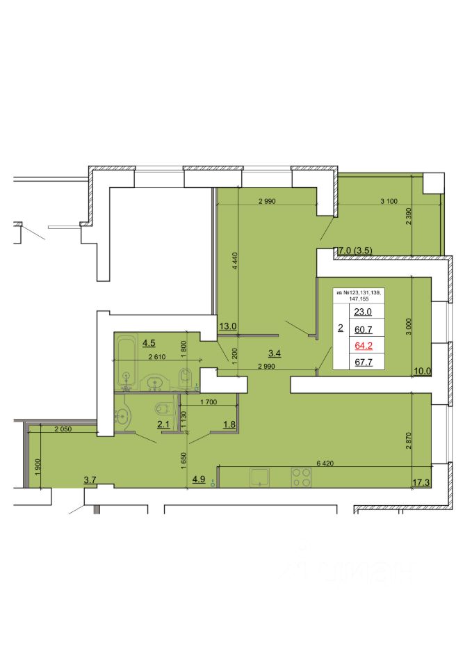 Продаётся 2-комнатная квартира в строящемся доме (Дом 2), срок сдачи: IV-кв. 2027, общей площадью 64.2 кв.м., на 5 этаже. Новый жилой комплекс ''Знак'' от застройщика ГК ''МастерСтрой'' расположен по адресу: Россия, Кострома, бульвар Маршала Василевского