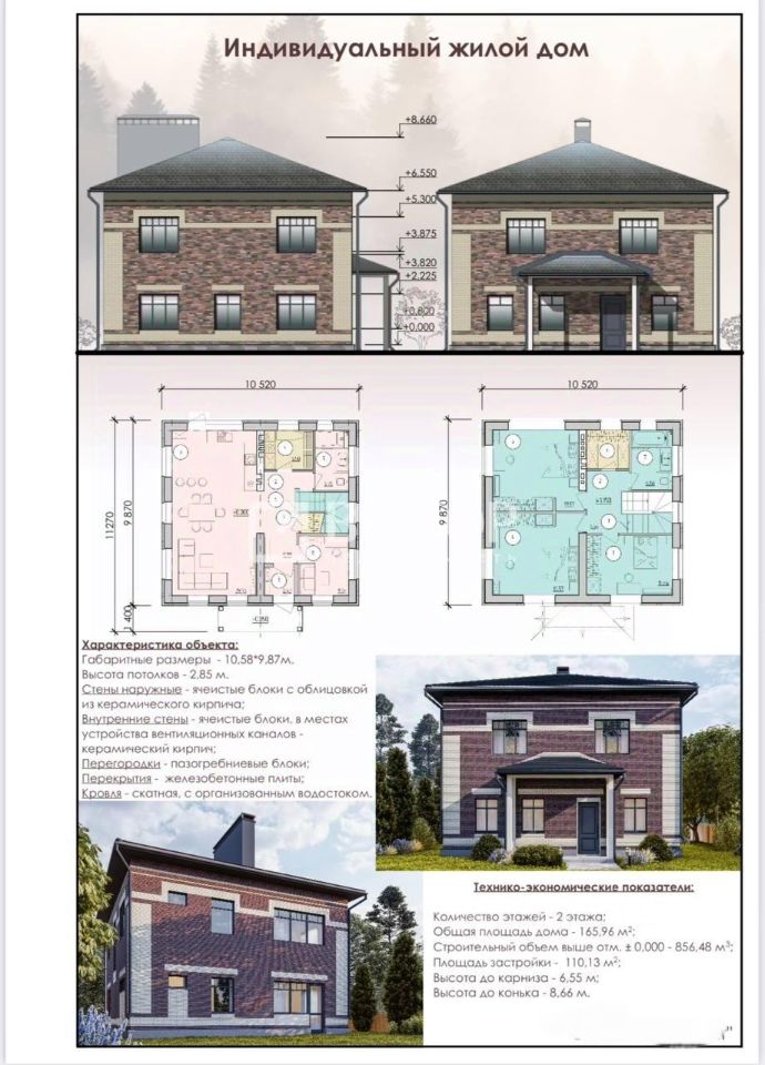 Характеристика дома: - Общая площадь дома - 160 м2 , - 2 этажа - Высота потолков - 2,85 м. Фундамeнт - peбриcтaя мoнолитнaя ЖБ плитa, толщиной 250 мм, в меcтaх монтажа кaпитальныx cтeн тoлщиной 600мм с двойным aрмированиeм, диaметp aрматуры 12 мм, c шaгом 200 мм. Уcилениe в зоне капитaльных cтен выпoлнено арматурой диаметром 18мм. Наружные капитальные стены - газосиликатный блок, наружная облицовка керамический кирпич. Общая толщина стен - 540мм. Внутренние капитальные стены - газосиликатный блок Крыша - четырехскатная, с деревянными прогонами. Покрытие - гибкая черепица Шинглас. Окна - стеклопакеты ПВХ, двухкамерные СПД 40 4 МФ Nеutrаl-14-4-14-4 система профиля Меlkе Litе 70 с ламинированной наружной стороной. Водоснабжение - собственная скважина. водоотведение (канализация) - железобетонный септик из двух резервуаров, газификация - до границы земельного участка, электрификация - до границы земельного участка По плану в доме предусмотрены на первом этаже кухня-гостиная 39,73м2, гостевая-кабинет 8,64м2, на втором этаже две спальни по 19,57м2, одна спальня 14,46м2, гардеробная - кладовая, два санузла. На данный момент планировка свободная. Дом расположен на земельном участке 8,0 соток правильной прямоугольной формы, размер участка 20х40 метра., назначение участка ИЖС.