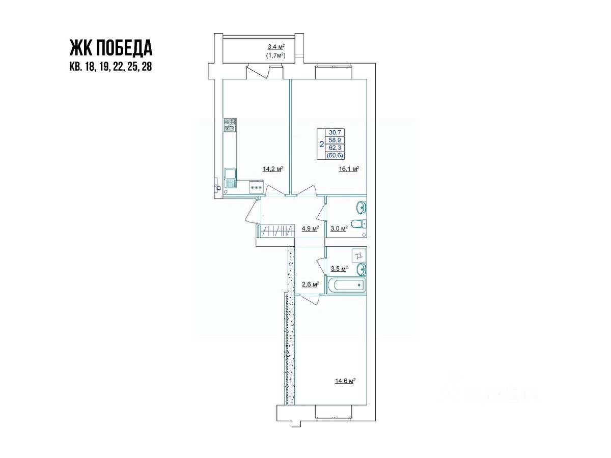 Общая площадь60,6 м2