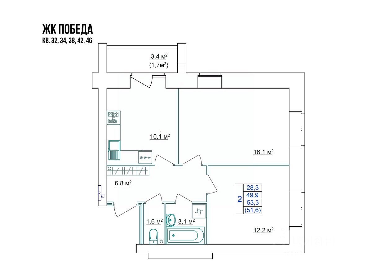 Общая площадь51,6 м2